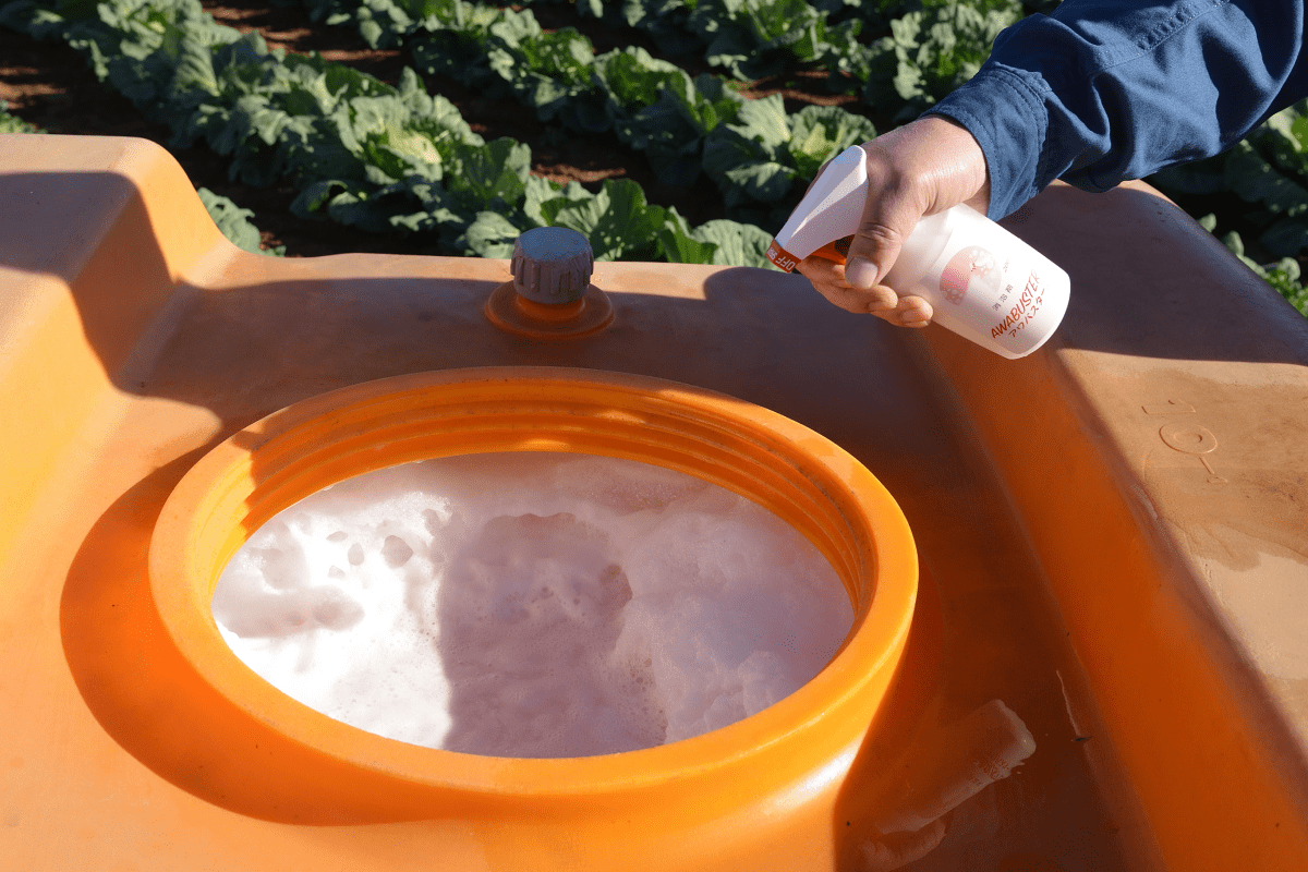 除草剤は原液を先にタンクに入れて、後から水を入れるので泡がモコモコに。アワバスターを使うと一瞬で泡が消えました!