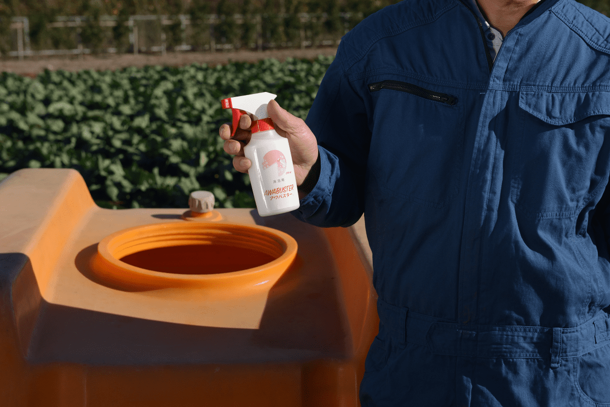 ・動力噴霧機、ブームスプレーヤ、スピードスプレーヤ等の農薬散布機の使用時に、タンク内に発生した泡に噴射すると有効です。また、農薬散布機の洗浄時に発生したタンク内の泡にも使用できます。