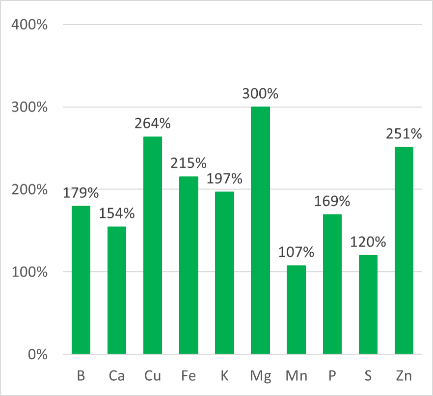 分析方法:試験開始72時間後に、無処理及びエクスプルートを処理した苗の根の元素組成を分析し、対無処理を算出した。