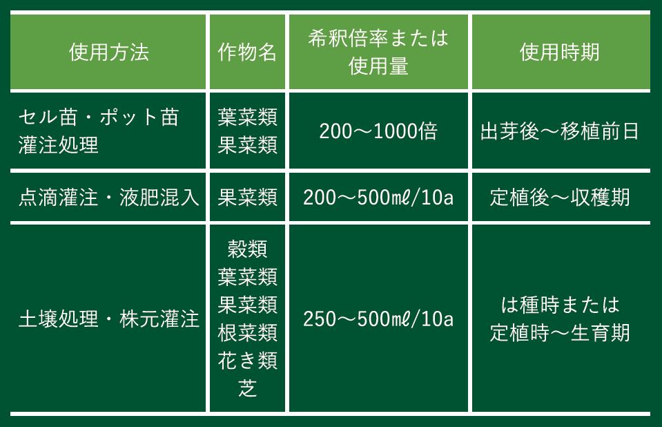 - 農薬や肥料と混用する場合は、事前に沈殿・凝集・薬害を確認した上でご使用ください。
